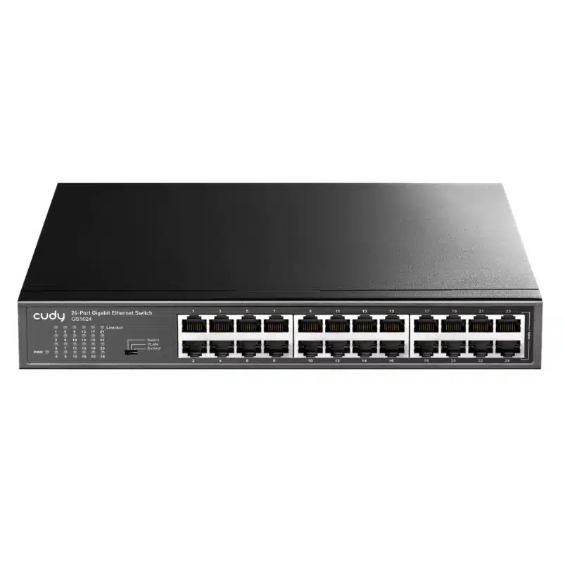 El Switch Cudy Gigabit GS1024 de 24 puertos con modos VLAN y extendido, sin ventilador, metal robusto y montaje para rack o escritorio. es un conmutador Gigabit no gestionable extremadamente versátil, especialmente diseñado para redes que requieren fiabilidad, rendimiento y cero ruido. Este switch de metal incluye 24 puertos RJ45 Gigabit, que se adaptan automáticamente a velocidades de 10/100/1000 Mbps, gracias a la tecnología Auto‑MDI/MDIX.